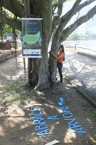 | Outra atividade realizada pelo projeto LUVAS foi a campanha Abrace uma Árvore, para promover a conscientização ambiental dos transeuntes na Lagoa Rodrigo de Freitas |