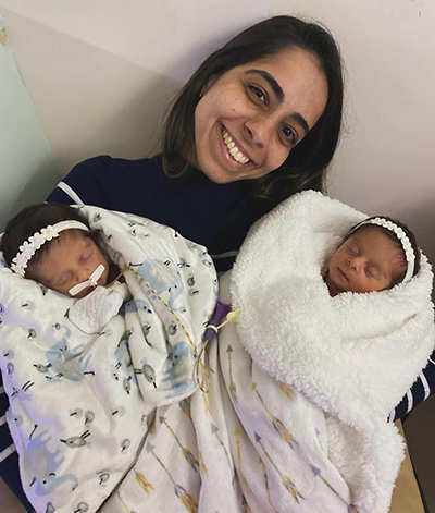 | As gêmeas Giovana e Beatriz, monozigóticas diamnióticas, nasceram prematuras, com 34 semanas de gestação |