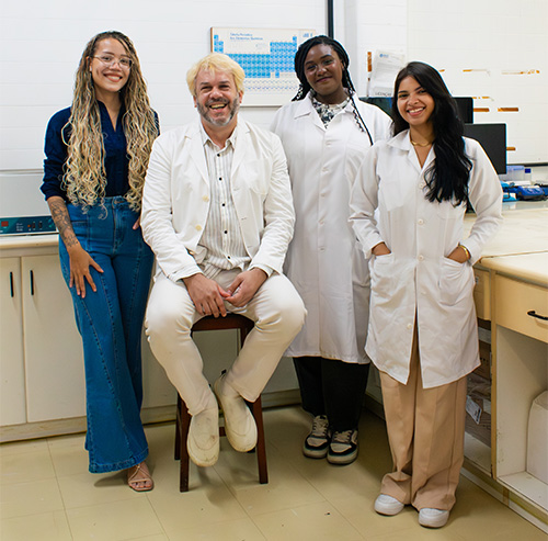 | A partir da esq., a primeira autora do artigo, Jéssica Ingrid Faria; o coordenador do Laboratório de Nanorradiofarmácia do IEN, Ralph Santos-Oliveira; e as bolsistas do programa Jovens Talentos, da FAPERJ, Gabriela Paixão e Luisa Muniz, que também acompanharam a equipe envolvida no trabalho (Foto: Adriana Vasconcelos/IEN) |