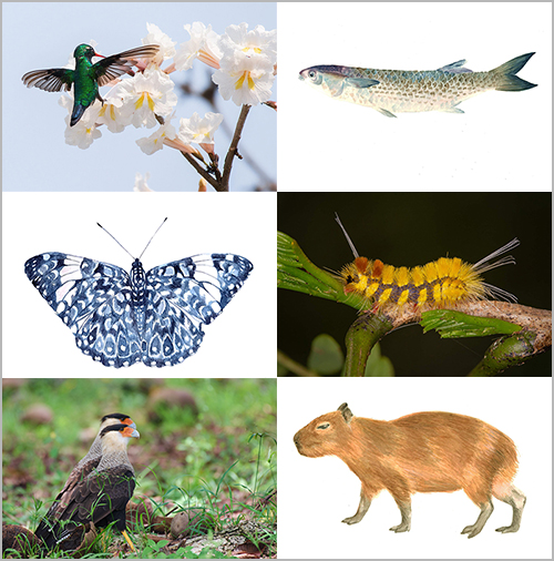 | Exemplos da fauna da Ilha do Bom Jesus, em fotos de Gabriel e Daniel Mello (beija-flor, carcará e lagarta) e ilustrações de Sara Fonseca (tainha) e Agnes Antonello (borboleta e capivara) |