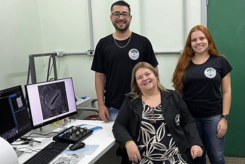 | Segundo a Profa. Maura da Cunha (ao centro), a microscopia confocal funciona como uma espécie de scanner em 3D, tirando várias "fatias" de uma amostra e formando uma imagem tridimensional |
