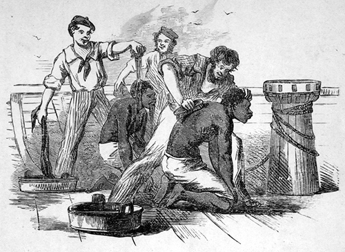 | Ilustração retrata o deck de um navio negreiro na Jamaica, no século XIX. Mais de 12 milhões de pessoas negras escravizadas cruzaram os oceanos entre os séculos XVI e XIX (Arte: "Deck of Slave Ship, Jamaica, 19th cent", disponível em: www.slaveryimages.org) |
